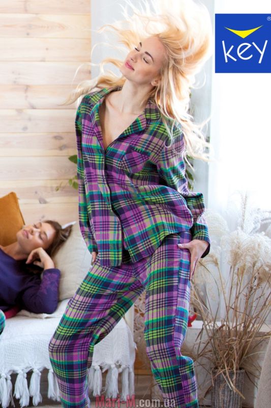 Фланелевая женская пижама LNS 409 B23 Key. Комфортная женская пижама из мягкого и теплого высококачественного натурального хлопка в клетчатый принт. В комплект входит рубашка с длинными рукавами и прямые свободные брюки на мягкой резинке в поясе. Рубашка классического кроя, с отложным воротничком, застегивается на пуговицы спереди, декорирована нагрудным кармашком. Брюки дополнены удобными боковыми карманами. Состав: 100% хлопок (фланель).