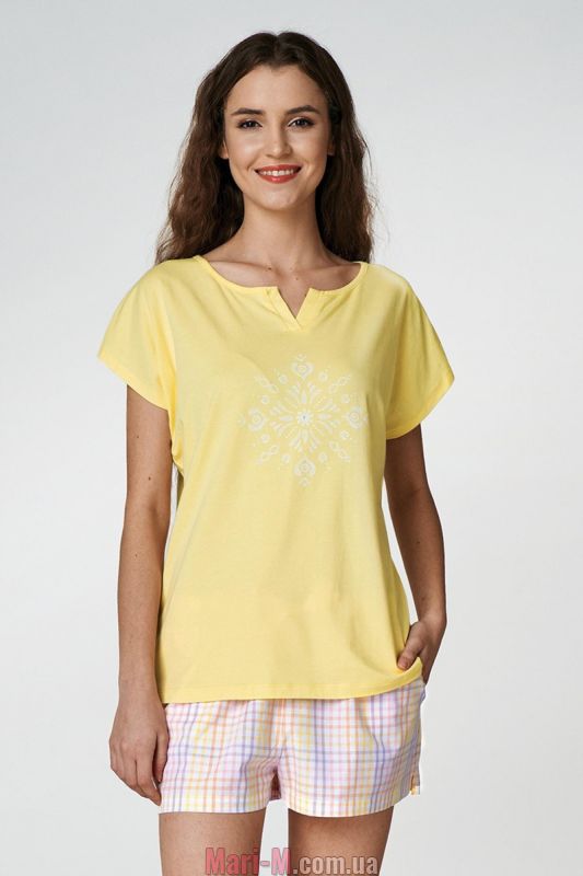 Домашний костюм/пижама LNS 420 A22 Key. Удобная летняя женская пижама сделана из высококачественной, приятной на ощупь хлопковой ткани. Свободная футболка с коротким рукавом украшена декоративным принтом. Шорты с небольшими разрезами по бокам и практичными карманами