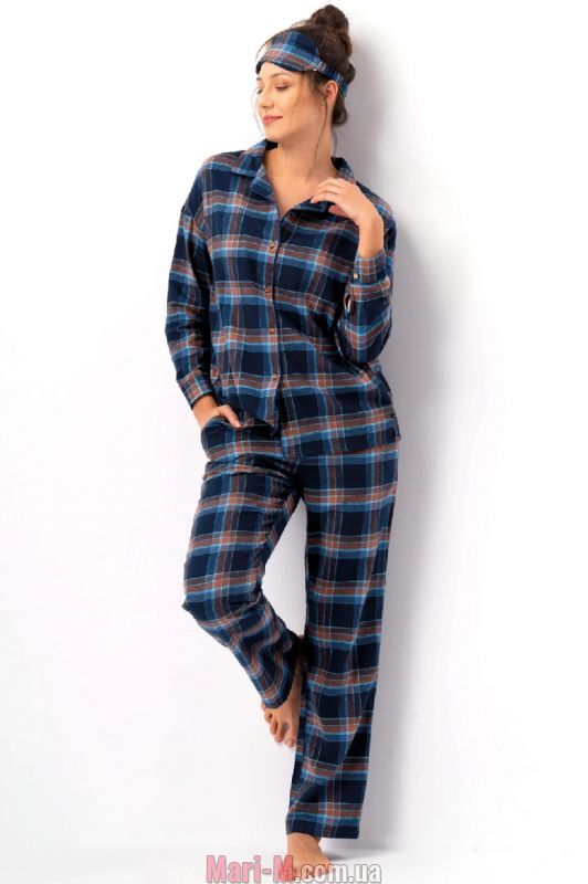 Фланелевая женская пижама LNS 431 Key. Комфортная женская пижама из мягкого и теплого высококачественного натурального хлопка в клетчатый принт в шоколадно-синих тонах с едва заметной мерцающей нитью. В комплект входит рубашка с длинными рукавами и прямые свободные брюки на мягкой резинке в поясе. Рубашка свободного кроя, с отложным воротничком, застегивается на пуговицы спереди, длинные рукава со спущенной плечевой линией и манжетами на пуговицах. Полочки и воротник отделаны узким кантом в тон. Брюки дополнены удобными боковыми карманами. Состав: 100% хлопок (фланель). Маска для сна в комплект не входит.