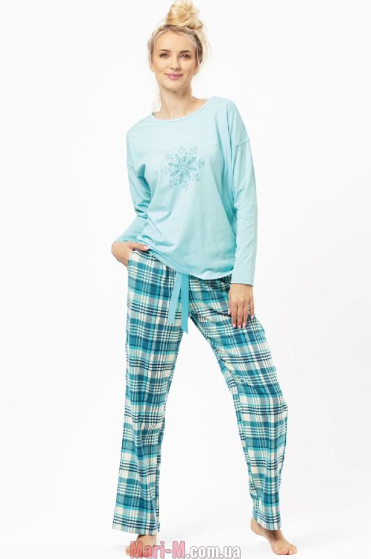 Хлопковая пижама LNS 474 B24 Key. Комфортная женская пижама состоит из однотонной трикотажной кофты и широких фланелевых брюк в крупную клетку. Кофта свободного кроя, с круглым вырезом горловины, длинные рукава со спущенной плечевой линией, украшена принтом на груди. Спинка удлиненная. Брюки с удобными боковыми карманами, с мягкой резинкой и атласной лентой на кулиске в поясе. Состав: верх - 65% хлопок, 35% полиэстер; низ - 100% хлопок (фланель).