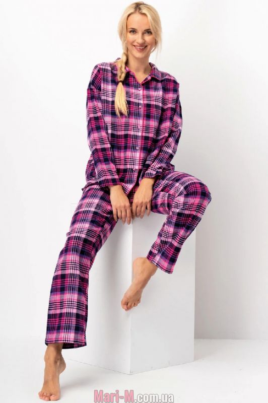 Фланелевая женская пижама LNS 490 Key. Комфортная женская пижама из мягкого и теплого высококачественного натурального хлопка в клетчатый принт в оттенках розового и темно-синего. В комплект входит рубашка с длинными рукавами и прямые свободные брюки на мягкой резинке в поясе. Рубашка свободного кроя, с отложным воротничком, застегивается на пуговицы спереди, длинные рукава со спущенной плечевой линией. Полочки и воротник отделаны узким кантом в тон. Брюки дополнены удобными боковыми карманами. Состав: 100% хлопок (фланель).