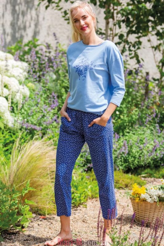 Хлопковая женская пижама LNS 550 A25 Key. Удобная и стильная женская пижама из очень мягкого натурального хлопкового трикотажа. В комплект входит однотонная голубая блуза и укороченные прямые брюки синего цвета с принтом в белый горошек. Блуза свободного кроя, с круглым вырезом горловины и рукавами ¾ со спущенной плечевой линией, украшена нежным синим принтом с изображением цветов и птицы на груди. Брюки с мягкой резинкой в поясе и удобными боковыми карманами. Состав: 100% хлопок.