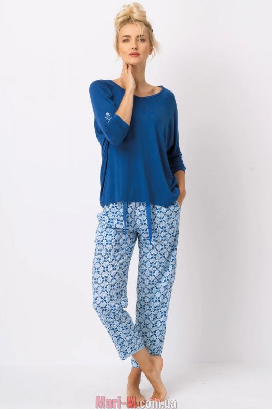 Женская пижама из вискозы LNS 721 A25 Key. Удобная женственная пижама. В комплект входит однотонная свободная блуза из легкого и приятного вискозного трикотажа синего цвета и укороченные брюки из вискозного полотна с графичным растительным принтом. Блузка с широкими рукавами-реглан длиной ¾, по низу с манжетами. Рукава украшены небольшим принтом. Широкий V-образным вырез горловины отделан узким кантом. Брюки с удобными боковыми карманами, в поясе широкая комфортная резинка и атласная лента на кулиске. Штанины немного заужены к низу. Состав: блуза - 95% вискоза, 5% эластан; брюки - 100% вискоза.