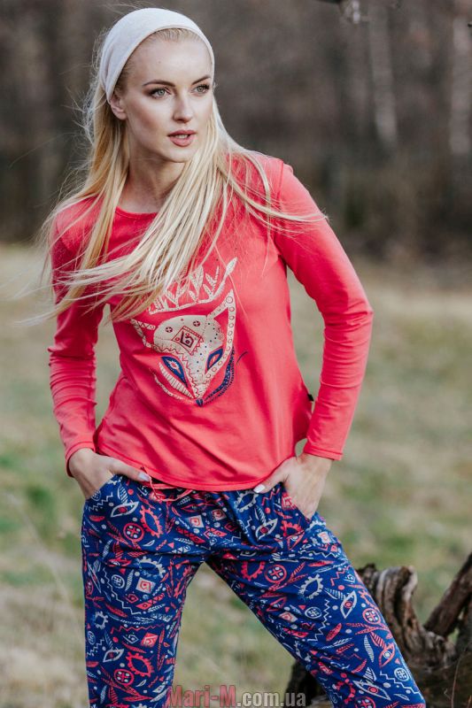 Хлопковая пижама LNS 736 B19 Key. Классическая женская пижама, выполненная из высококачественного мягкого хлопка. Состоит из однотонного джемпера красного цвета и темно-синих брюк в абстрактный принт. Джемпер прямого свободного силуэта, с длинными рукавами и круглым вырезом горловины, на груди по центру украшен принтом в виде лисицы. Брюки прямые, с мягкой резинкой в поясе, удобными боковыми карманами, регулируются по ширине шнурком в поясе. Состав: 95% хлопок, 5% эластан.
