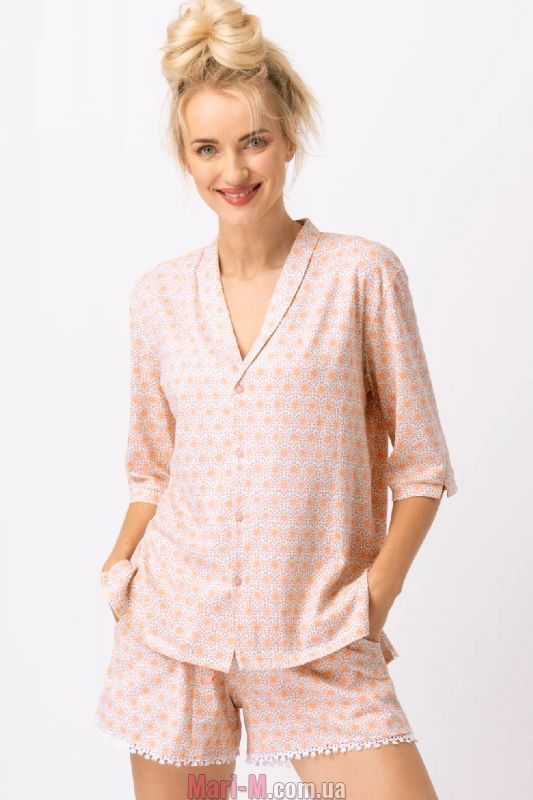 Легкая женская пижама из хлопка LNS 753 A25 Key. Очень нежная и стильная женская пижама выполнена из мягкого натурального хлопкового трикотажного полотна с графичным цветочным узором. В комплект входит свободная рубашка с прямыми рукавами ¾ и шорты. Рубашка с V-образным вырезом горловины и небольшим отложным воротничком, застегивается на пуговицы, по бока небольшие разрезы. Шорты с мягкой резинкой и шнурком на кулиске в поясе, по бокам карманы, по низу отделаны кружевной тесьмой. Состав: 100% хлопок.