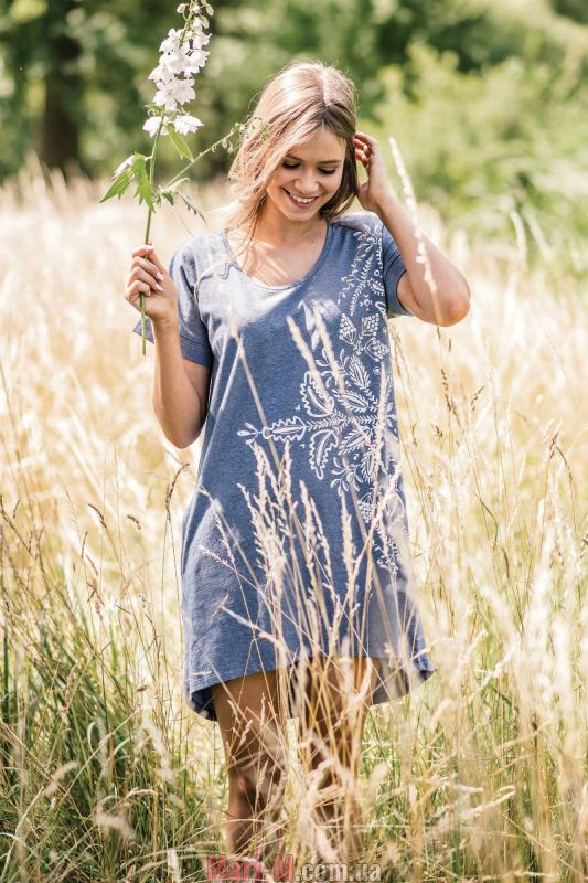 Ночная сорочка/домашнее платье из хлопка LHD 745 А19 Key. Женственное летнее платье из уникальной синей меланжевой ткани. Оригинальный принт в фольклорном стиле, вдохновленный вышивками из Куявии. Сорочка свободного кроя, с короткими рукавом и округлым вырезом горловины. В качестве декора с левой стороны принт белого цвета в этническом стиле, по низу сорочка асимметрична, по бокам удобные карманы. Состав: 95% хлопок, 5% эластан.