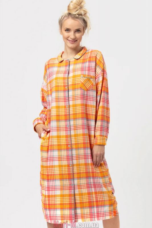 Удлиненная ночная сорочка из фланели LND 473 B24 Key. Комфортная ночная сорочка из мягкого и теплого высококачественного натурального хлопка в клетчатый принт. Модель свободного рубашечного кроя, длиной ниже колен, с круглым отложным воротничком, застегивается на пуговицы спереди, декорирована накладным карманом на груди. Длинные рукава с широкими манжетами на пуговицах. Полочки и воротник по краю отделаны тонким кантом в тон принту. По бокам удобные карманы. Состав: 100% хлопок (фланель).