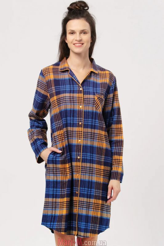 Фланелевая ночная сорочка LND 481 B24 Key. Комфортная ночная сорочка из мягкого и теплого высококачественного натурального хлопка в клетчатый принт. Модель классического рубашечного кроя, с длинными рукавами и отложным воротничком, застегивается на пуговицы спереди, декорирована накладным карманом на груди. Подол закруглен к бокам, спинка немного удлиненная. Полочки и воротник по краю отделаны тонким кантом в тон принту. По бокам удобные карманы. Состав: 100% хлопок (фланель).