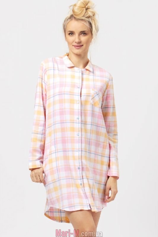 Ночная сорочка из фланели LND 486 B24 Key. Комфортная ночная сорочка из мягкого и теплого высококачественного натурального хлопка в клетчатый принт. Модель классического рубашечного кроя, с длинными рукавами, высоким вырезом горловины и отложным воротничком, застегивается на пуговицы спереди, декорирована накладным карманом на груди. Подол закруглен к бокам, спинка немного удлиненная. По бокам удобные карманы. Состав: 100% хлопок (фланель). Маска для сна в комплект не входит.