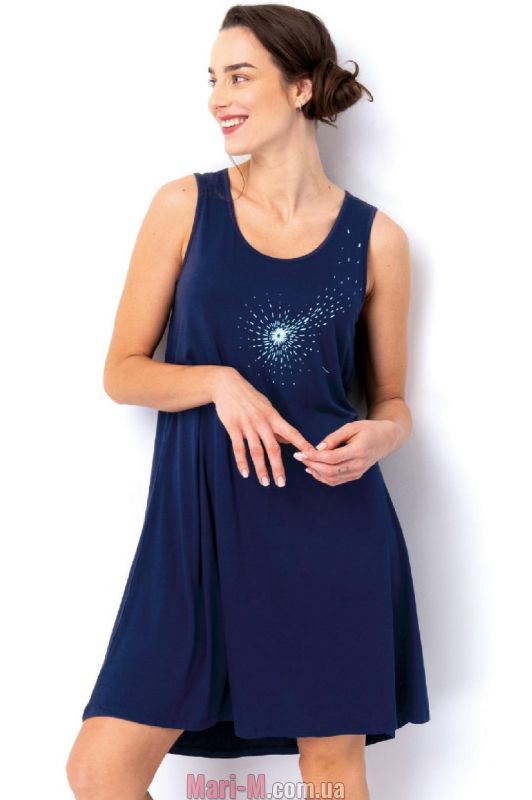 Ночная сорочка из вискозы LND 764 A25 Key. Лаконичная ночная сорочка выполнена из очень легкого, нежного и дышащего вискозного трикотажа темно-синего цвета, декорирована принтом в виде падающей звезды с крупным цирконом. Модель А-силуэта с удлиненной спинкой прекрасно сидит на любой фигуре. Широкие бретели, глубокий круглый вырез. Состав: 95% вискоза, 5% эластан.