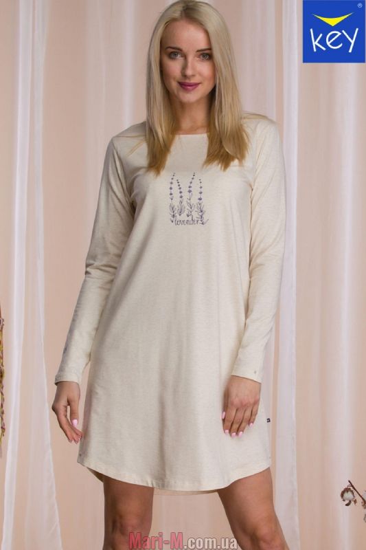 Хлопковая ночная сорочка LND 941 B21 Key. Свободная ночная сорочка из мягкого хлопкового трикотажа. Модель с длинными рукавами и круглым вырезом горловины, декорирована принтом на груди и на рукавах. Состав: 95% хлопок, 5% эластан.