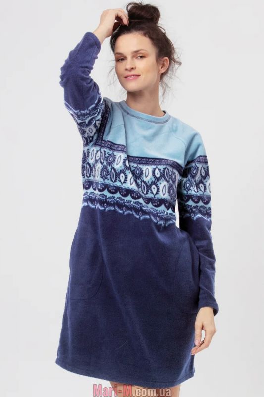 Домашнее платье из микрофлиса LHD 893 B24 Key. Теплое домашнее платье выполнено из качественного мягкого микрофлиса в сине-голубых цветах, декорировано графичным принтом в этническом стиле на лифе и рукавах. Модель свободного кроя, длиной немного выше колен, с длинными рукавами и неглубоким круглым вырезом горловины, по бокам удобные карманы. Состав: 100% полиэстер (микрофлис).