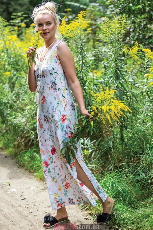 Длинное домашнее платье из вискозы LHD 906 1 A21 Key. Стильное домашнее платье-макси из легкой и приятной вискозы с ярким цветочным принтом. Модель свободного кроя, на широких бретелях, с круглым вырезом горловины и высокими разрезами по бокам. На спинке глубокий вырез, декорированный имитацией шнуровки. Состав: 95% вискоза, 5% эластан.