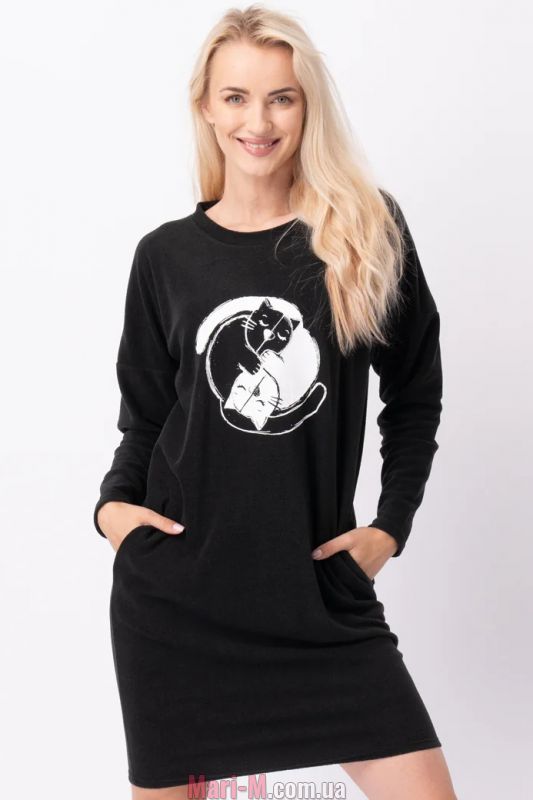 Домашнее платье из микрофлиса LHD 922 B24 Key. Теплое домашнее платье выполнено из качественного мягкого микрофлиса черного цвета, на груди декорировано забавным принтом с изображением спящих кошек с мотивом инь-янь. Модель длиной немного выше колен, с длинными рукавами и неглубоким круглым вырезом горловины, по бокам удобные карманы. Комфортный свободный верх платья сочетается с зауженной нижней частью, подчеркивающей фигуру. Состав: 100% полиэстер (микрофлис).