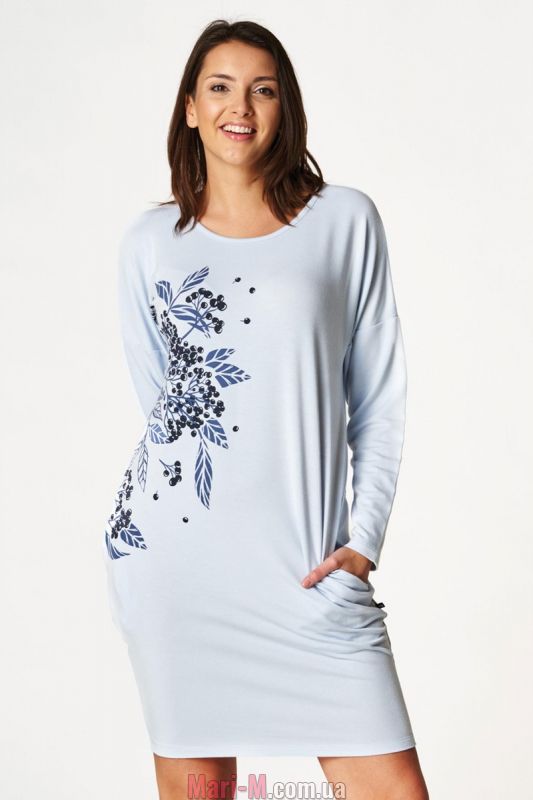 Женское платье LHD 976 B22 Key из мягкого, эластичного и очень удобного трикотажа с добавлением вискозы. Очень легкое и в то же время дарящее тепло. С длинными рукавами и карманами. Длина выше колена. Синий цвет с мотивом черной бузины.