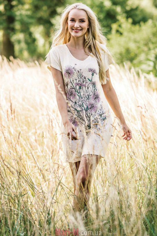 Ночная сорочка из вискозного трикотажа LHT 520 А19 Key. Летняя туника из легкого вискозного трикотажа. Уникальная бежевая меланжевая ткань с золотой нитью и рисунком букета из луговых васильков. Туника свободного кроя, с короткими рукавом и V-образным вырезом горловины. Передняя полочка украшена цветным принтом полевых цветов, на спинке вырез капля. Состав: 60% вискоза, 35% полиэстер, 5% эластан.