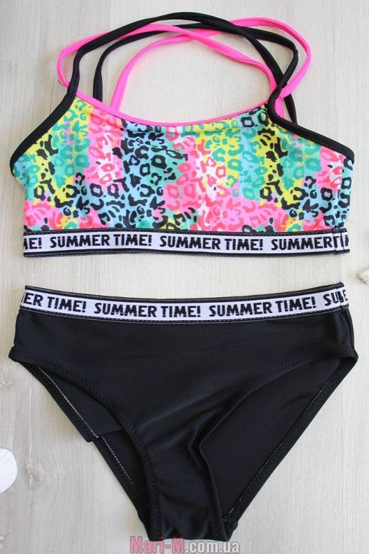 Раздельный купальник для девочки Oliwia 02 Keyzi. Раздельный купальник в спортивном стиле. Топ с ярким многоцветным анималистичным принтом и двойными тонкими эластичными бретелями контрастных оттенков, перекрещивающимися на спинке. Плавки однотонные, классического фасона. Топ снизу и плавки в поясе отделаны широкой резинкой с надписью «Summer time!». Для заказа доступны несколько вариантов расцветок. Размер по росту ребёнка.