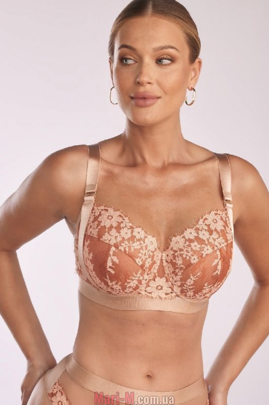 Мягкий кружевной бюстгальтер SC-1111 Sylvie Kinga. Элегантный стильный бюстгальтер на базе модели Michelle для обладательниц пышной груди. Выполнен из прозрачной микросетки песочного цвета с бежевым цветочным узором и бежевой эластичной микросетки. Мягкие чашки на каркасах хорошо поддерживают грудь и собирают ее благодаря боковой корректирующей детали. Внутри чашек подкладка из стабилизирующей микросетки. Оригинальность и современный вид модели придает отделка блестящими эластичными атласными лентами, которые также обеспечивают дополнительную поддержку. Под грудью широкая эластичная резинка с атласным блеском. Спинка гладкая, из функционального сетчатого полотна. Широкие бретели не отстегиваются, регулируются по длине. На спине застежка на крючки. Состав: 87% полиамид, 13% эластан.