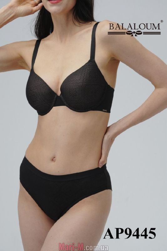 Комплект белья: бюстгальтер с формованными чашками и трусики бразилианы 9445 Balaloum. Стильный и комфортный комплект нижнего белья выполнен из эластичного сетчатого полотна с тонким геометрическим узором и гладкой эластичной микрофибры. Бюстгальтер с формованными чашками из тонкого поролона на каркасах. Чашки сверху покрыты узорчатой сеточкой, пояс выполнен из микрофибры с бесшовной отделкой края. Бретели не отстегиваются, регулируются по длине. На спине застежка на 2 крючка. В комплекте трусики бразилианы с хлопковой ластовицей. Передняя деталь трусиков из узорчатого полотна, задняя часть – из двойной микрофибры с плоскими бесшовными краями всгиб. В поясе широкая резинка.