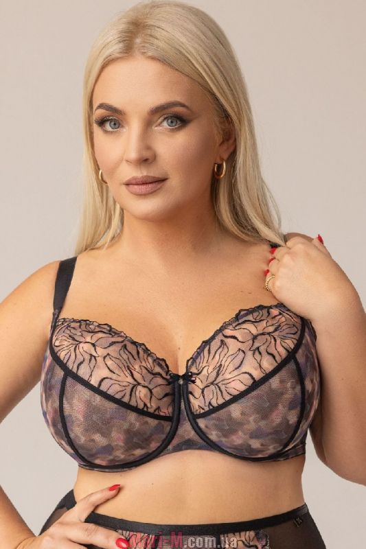 Мягкий бюстгальтер с вышивкой soft G-Blurry Kris Line. Изысканный и очень комфортный бюстгальтер с тонкой цветочной вышивкой. Выполнен из сеточки с абстрактным узором в бежево-коричневых тонах, отделан узкими черными кантами. Чашки на каркасах, с тройным диагональным членением. Нижняя часть чашек на подкладке из стабилизирующей микросетки. Верхняя деталь украшена тонкой цветочной вышивкой черного цвета. По верхнему краю с внутренней стороны вшита тонкая резиночка для лучшего прилегания к телу. Спинка гладкая, из эластичной микрофибры. Боковые детали укреплены вертикальными косточками. Бретели регулируются по длине, не отстегиваются, их ширина зависит от размера. На спине застежка на крючки. Бюстгальтер хорошо поддерживает грудь больших и средних размеров, придает ей красивую естественную форму. Состав: 80% полиамид, 10% эластан, 5% полиэстер, 5% хлопок.