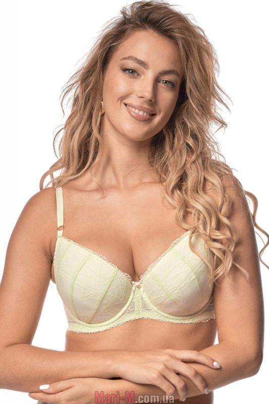 Кружевной бюстгальтер push-up Janette Mefemi by Nipplex. Очаровательный женственный бюстгальтер с дублированными чашками и съемными вкладышами пуш-ап. Чашки на каркасах, изнутри на хлопковом подкладе, сверху покрыты ажурным кружевом в нежном салатовом оттенке. Бретели не отстегиваются, регулируются по длине. Пояс из эластичного кружева, боковые детали укреплены вертикальными косточками. Бюстгальтер позволяет визуально увеличить грудь, маскирует асимметрию и формирует эффектное декольте. Состав: 60% полиамид, 16% полиэстер, 10% хлопок, 7% эластан, 7% другие волокна.