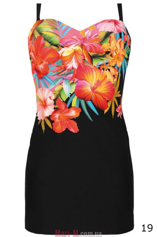 Слитный купальник-платье S1035J19 Self. Оригинальный сплошной с узкой короткой юбочкой, прикрывающей бедра и ягодицы. Лиф-балконет с плотными формованными чашечками и вкладками пуш-ап украшен ярким цветочными принтом. Тонкие бретели отстегиваются и регулируются по длине. На спине застежка. В нижней части купальника – подкладка из сетки. Плавки вшитые. Сзади вырез полукруг без застежки.