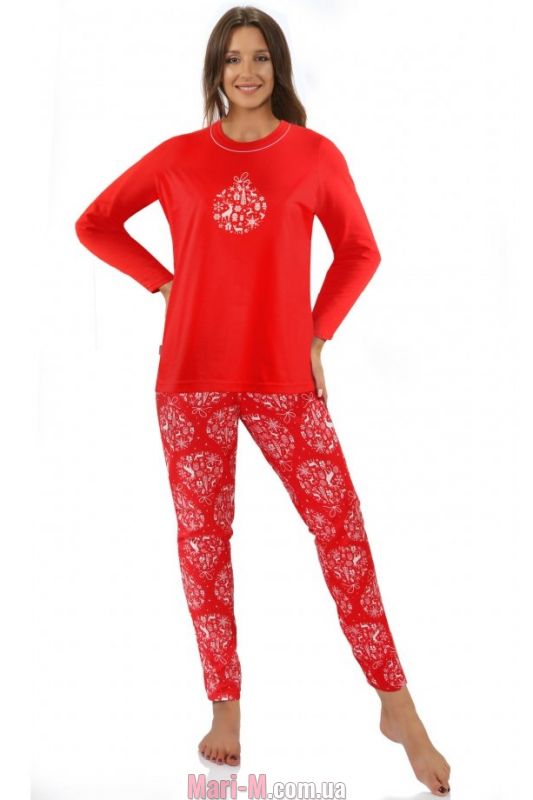 Женская хлопковая пижама Bombka Sesto Senso. Пижама выполнена из мягкого натурального хлопкового трикотажа. В комплект входит однотонная кофта и зауженные брюки с принтом в рождественской тематике. Кофта с длинным рукавом и неглубоким круглым вырезом горловины, украшена принтом на груди. Брюки на мягкой резинке в поясе. Состав: 100% хлопок.