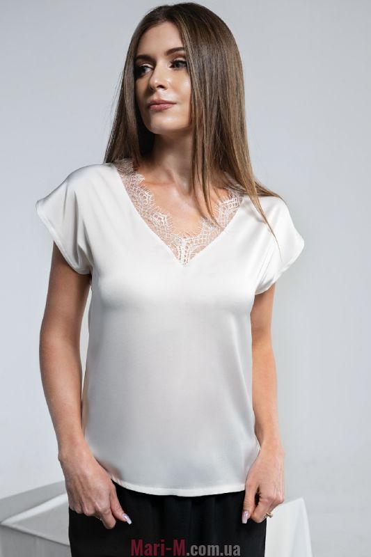 Шелковая блуза с кружевом 1831 Shato. Блуза выполнена из приятного атласного материала (шелк Армани). Модель прямого кроя, с короткими цельнокроеными рукавами и V-образным вырезом горловины, декорированным нежным кружевом с волнистым краем и ресничками. Состав: 100% полиэстер.