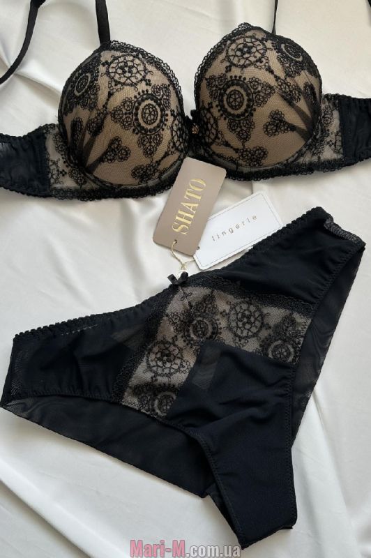Ажурные бразилианы с вышивкой SS199 Shato. Трусики выполнены из прозрачной черной микросетки, спереди украшены вставкой из тюля с изысканной графичной вышивкой на подкладке из бежевой микросетки. Задняя часть из двойной микросетки с плоскими бесшовными краями всгиб. Хлопковая ластовица.
