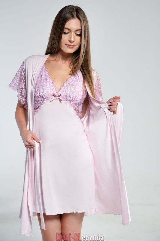 Халат из вискозы с кружевом 1814/1 Shato. Халат выполнен из мягкой и приятной вискозы. Модель на запах под пояс, с короткими ажурными рукавами из нежного кружева с волнистым краем и ресничками. Состав: 95% вискоза, 5% эластан.