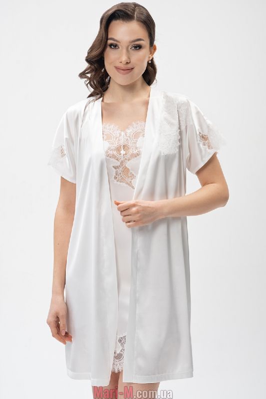 Атласный халат с кружевными вставками 2401/1 Shato. Халат выполнен из приятного шелковистого материала с атласным блеском и украшен фигурными вставками из нежного ажурного кружева с ресничками на рукавах и на плече. Модель на запах под пояс, с короткими рукавами. Состав: 100% полиэстер. Сорочка в комплект не входит. Её можно приобрести по ссылке ниже на странице, в товарах Для комплектации.