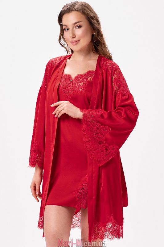 Атласный халат с кружевом 2500/1 Shato. Халат выполнен из приятного шелковистого атласного материала и украшен вставками из нежного цветочного кружева на плечах. Модель на запах под пояс, с длинными широкими рукавами со спущенной плечевой линией и мягкой сборкой. Подол халата и низ рукавов отделан фигурным цветочным кружевом. Состав: 100% полиэстер. Сорочка в комплект не входит. Её можно приобрести отдельно по ссылке ниже на странице, в товарах Для комплектации.