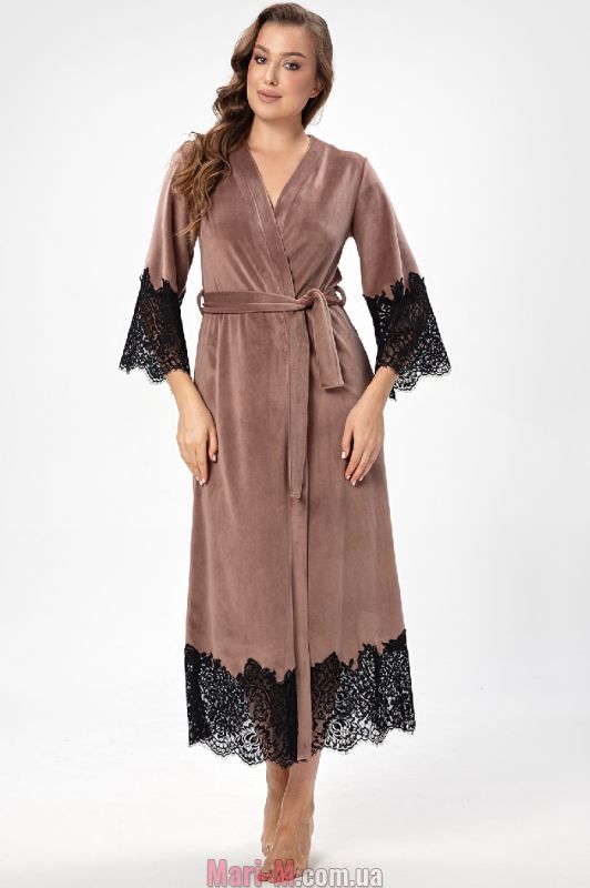 Длинный велюровый халат с кружевом 2527 Shato. Элегантный халат из очень приятного на ощупь бархатистого велюрового материала светло-коричневого оттенка, декорированный широким черным кружевом с цветочным узором и волнистым краем с ресничками по низу рукавов и подолу. Модель на запах под пояс, с широкими рукавами длиной 3/4. Состав: 100% полиэстер.