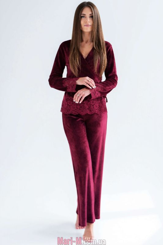 Велюровый комплект с кружевом 1927 Shato. Элегантный домашний костюм из очень приятного на ощупь велюрового материала, декорированный широким кружевом с цветочным узором и волнистым краем по низу рукавов и подолу. В комплект входит кофта на запах с длинными широкими рукавами и свободные брюки. Состав: 100% полиэстер.