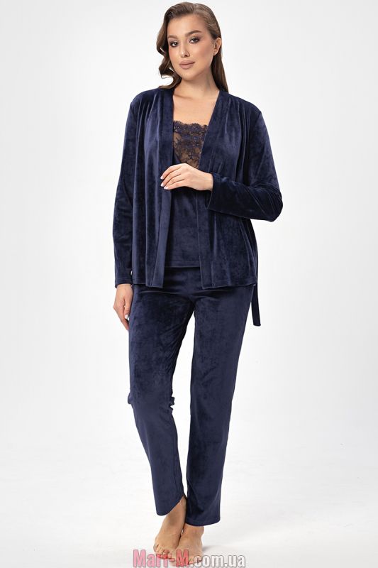 Комплект-тройка из велюра с кружевом 2525 Shato. Элегантный домашний костюм-пижама из очень приятного на ощупь бархатистого велюрового материала. В комплект входит укороченный кардиган, прямые брюки на мягкой резинке в поясе и майка на тонких эластичных бретелях. Кардиган завязывается с помощью пояса. Майка декорирована треугольной вставкой из ажурного цветочного кружева с фигурным краем и ресничками. Костюм подходит как для сна, так и для отдыха дома. Состав: 100% полиэстер.