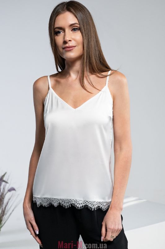 Шелковая майка с кружевом 1835 Shato. Майка на тонких бретелях выполнена из приятного к телу шелковистого материала с атласным блеском (шелк Армани), по низу украшена ажурным кружевом с фигурным краем и ресничками. Состав: 100% полиэстер.