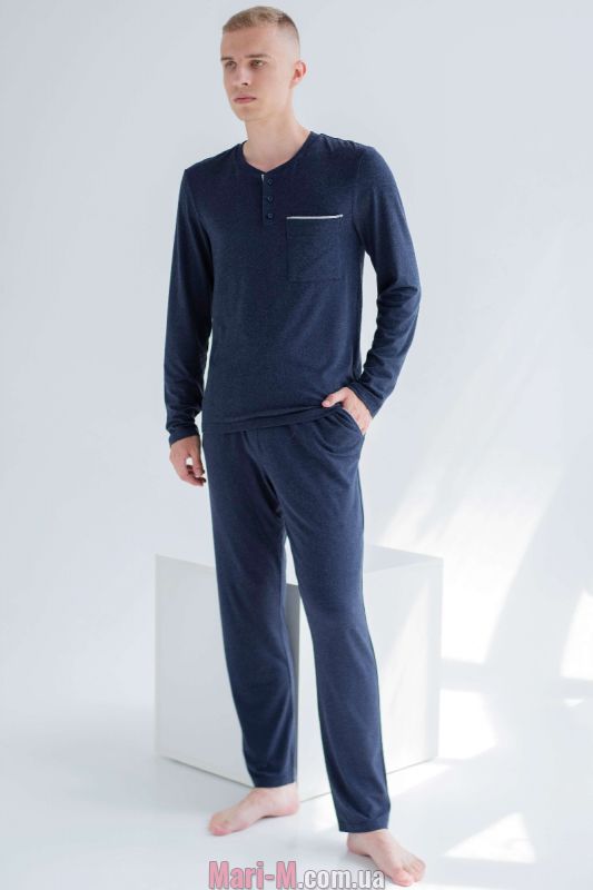 Мужская пижама из вискозы 1923 Shato. Пижама выполнена из мягкого и приятного вискозного меланжевого трикотажа. В комплект входит кофта с длинными рукавами и прямые брюки на мягкой резинке в поясе. Кофта с неглубоким круглым вырезом горловины, дополненным планкой на пуговицах, декорирована накладным карманом на груди, брюки с удобными боковыми карманами. Состав: 95% вискоза, 5% эластан.