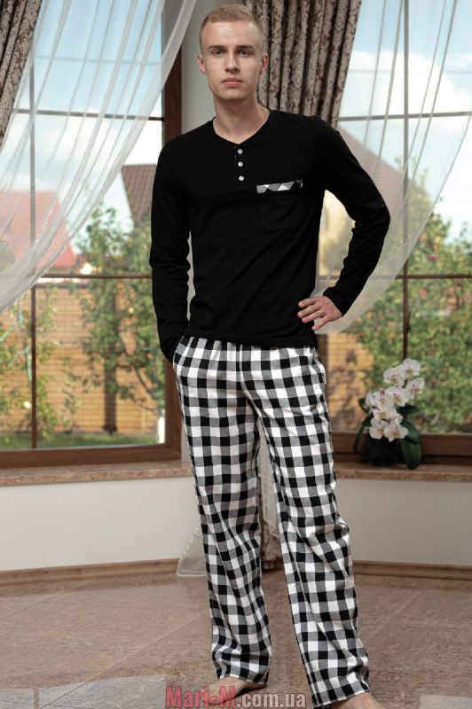 Хлопковая мужская пижама 1942 Shato. Удобная мужская пижама из мягкого натурального хлопка. В комплект входит однотонная трикотажная футболка с длинным рукавом и свободные прямые брюки из фланели в черно-белую клетку. Футболка декорирована накладным карманом с принтованной вставкой на груди, круглый вырез горловины дополнен планкой на пуговицах. Брюки на мягкой резинке в поясе, с удобными боковыми карманами. Состав: 100% хлопок.