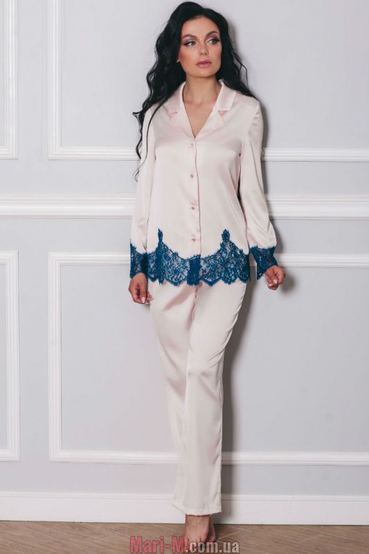 Атласная пижама с кружевом 1505 Shato. Элегантная атласная пижама, украшенная вставками из кружева. В комплект входит рубашка на пуговицах с длинными рукавами и свободные брюки на мягкой резинке в поясе. Рубашка свободного покроя, с V-образным вырезом и отложным воротничком, украшена роскошным кружевом на рукавах и по низу. Состав: 100% полиэстер.