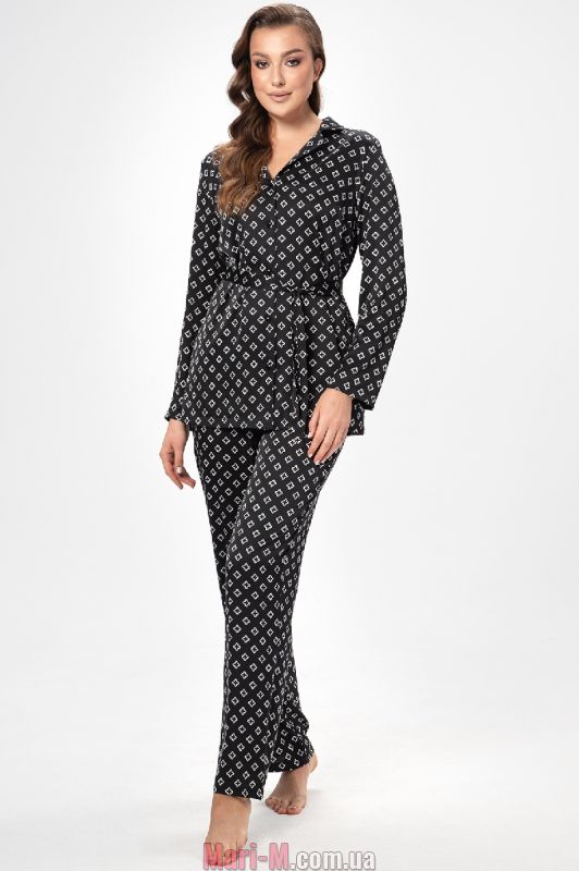 Пижама 2508 Shato. Элегантная пижама из приятного материала с графичным принтом. Комплект состоит из свободной рубашки с длинными прямыми рукавами и прямых брюк на мягкой резинке в поясе. Рубашка с фигурным отложным воротником, застегивается спереди на пуговицы, дополнена поясом. Состав: 100% полиэстер.