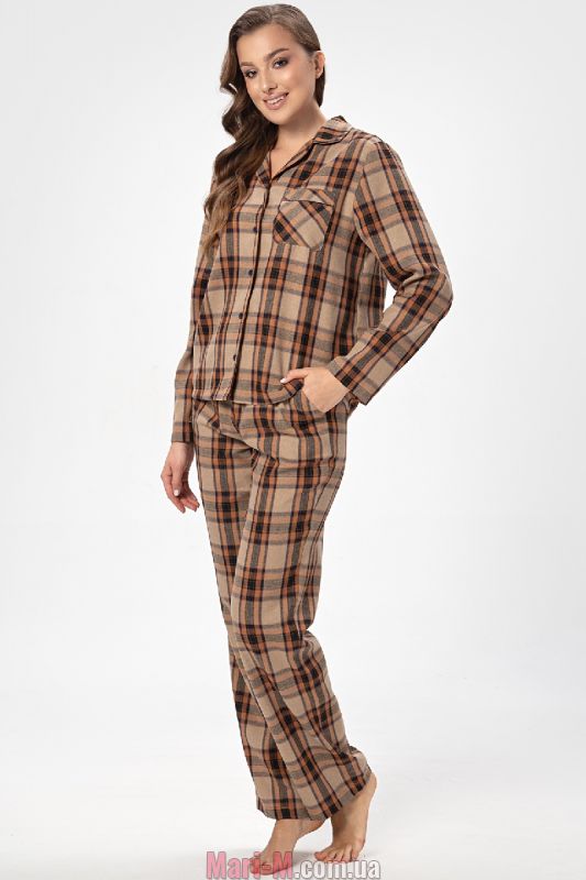 Женская пижама из фланели 2524 Shato. Пижама выполнена из мягкого и приятного натурального хлопкового полотна в крупную клетку. В комплект входит рубашка с длинными рукавами и отложным воротничком и свободные прямые брюки на мягкой резинке в поясе. Рубашка украшена накладным карманом на груди. Состав: 100% хлопок (фланель).