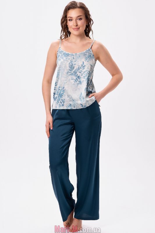 Атласная пижама с брюками 2602 Shato. Элегантная пижама из очень приятного на ощупь шелковистого материала. Комплект состоит из майки на тонких бретелях с оригинальным принтом и однотонных прямых свободных брюк на мягкой резинке в поясе. Брюки с боковыми карманами. Состав: 100% полиэстер.