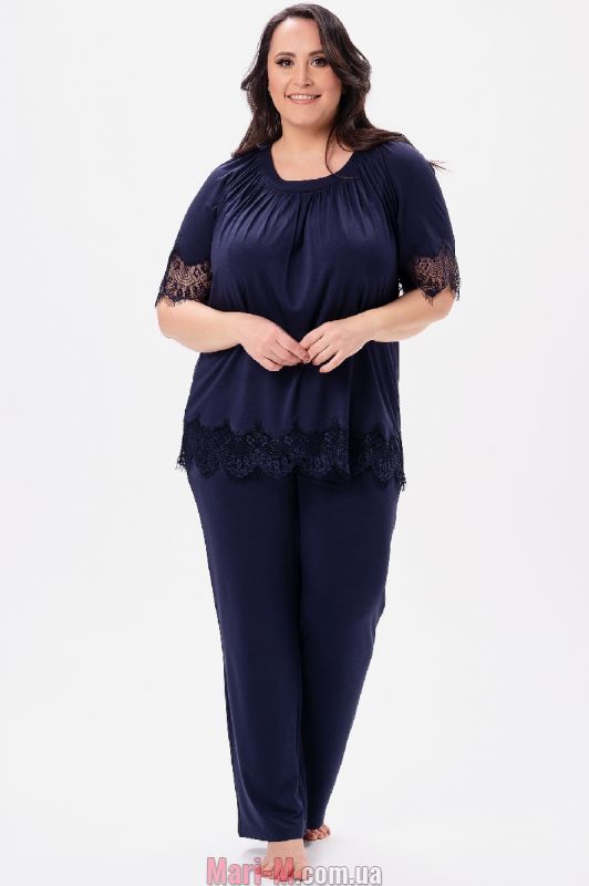 Пижама из вискозы с кружевом 2623 Shato. Очень женственная и удобная пижама выполнена из мягкого вискозного трикотажа, украшена нежным цветочным кружевом с волнистым краем и ресничками. В комплект входит футболка с рукавами ½ и круглым вырезом горловины и прямые свободные брюки на мягкой резинке в поясе. Футболка свободного кроя, с мягкими складками от выреза. Состав: 95% вискоза, 5% эластан.