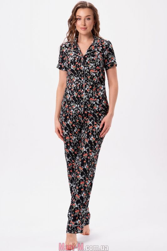 Пижама из хлопка и вискозы с брюками 2627 Shato. Легкая и комфортная пижама из приятного к телу хлопкового материала с добавлением вискозы, украшенного цветочным принтом по всему полотну. В комплект входит рубашка с коротким рукавом и классические прямые брюки на мягкой резинке в поясе. Рубашка с V-образным вырезом и фигурным отложным воротничком, застегивается спереди на пуговицы, на груди накладной карман. Воротник, полочки, рукава и штанины отделаны тонким контрастным кантом. Состав: 70% хлопок, 30% вискоза.