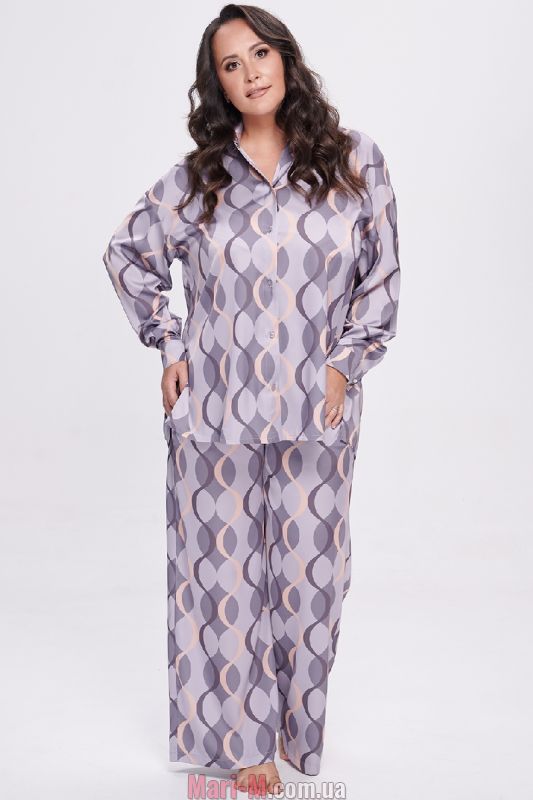 Свободная шелковая пижама с принтом 2705 Shato. Очень удобная и стильная пижама из приятного шелковистого материала с абстрактным графичным принтом. В комплект входит свободная рубашка с длинными рукавами и широкие брюки. Рубашка с отложным воротником, застегивается на пуговицы спереди. Рукава со спущенной плечевой линией и широкими манжетами на пуговицах. Спинка удлиненная, по бокам разрезы. Брюки на мягкой резинке в поясе. Состав: 100% полиэстер.