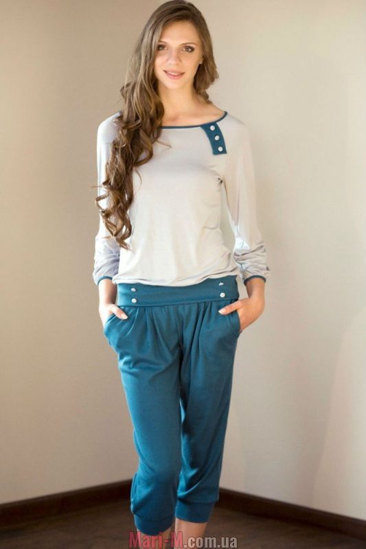 Пижама/костюм для дома из вискозы 516 Shato. Стильный домашний комплект/пижама выполнена из мягкого и приятного вискозного трикотажа. В комплект входят блуза свободного кроя неглубоким вырезом-лодочкой и широкими рукавами длиной 3/4, присобранными по низу, и бриджи с мягкой широкой резинкой в поясе. Широкий пояс на блузе, канты по низу рукавов и вырезу горловины, а также декоративная планка с пуговицами выполнены из контрастного материала в тон бриджам. Бриджи свободного кроя, с мягкими складками в талии и удобными боковыми карманами, штанины заканчиваются широкими манжетами. Подходит как для сна, так и для отдыха дома. Состав: 95% вискоза, 5% эластан.