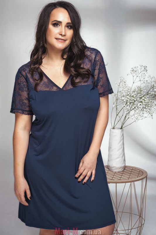 Ночная сорочка из вискозы с кружевным верхом 1345 Shato. Стильная ночная сорочка с короткими рукавами выполнена из мягкого вискозного трикотажа и элегантного кружева с цветочным узором. Модель свободного силуэта, длиной до середины колен, с V-образными вырезами. Глубокий вырез на спинке декорирован тонкими перекрещенными ремешками. Состав: 94% вискоза, 6% эластан.