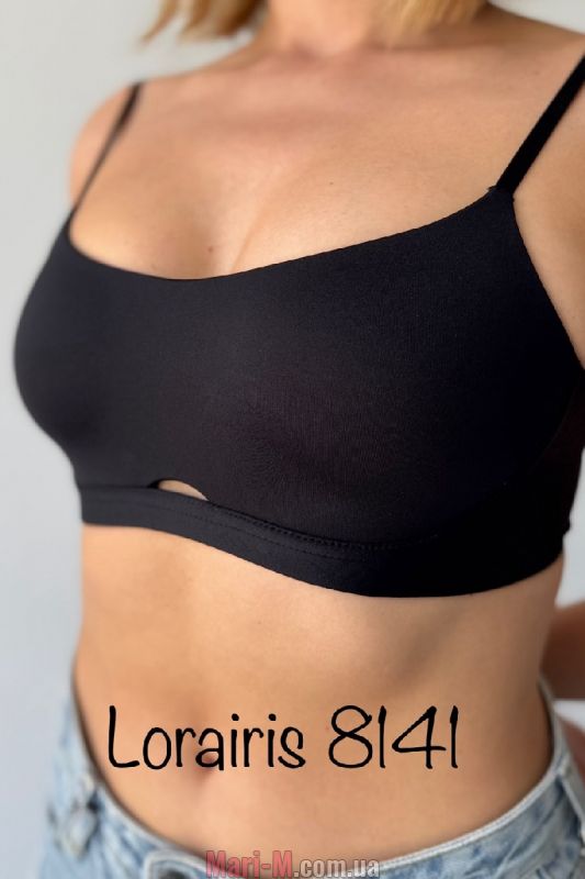 Топ-бюстгальтер 8141 Lora Iris. Бюстгальтер-топ выполнен из гладкой эластичной микрофибры. Модель без выделенных чашечек, снизу небольшой полукруглый вырез. Тонкие несъемные бретели. На спине застежка на крючки. Топ без каркасов, с тонким поролоновым вкладышем в чашке.