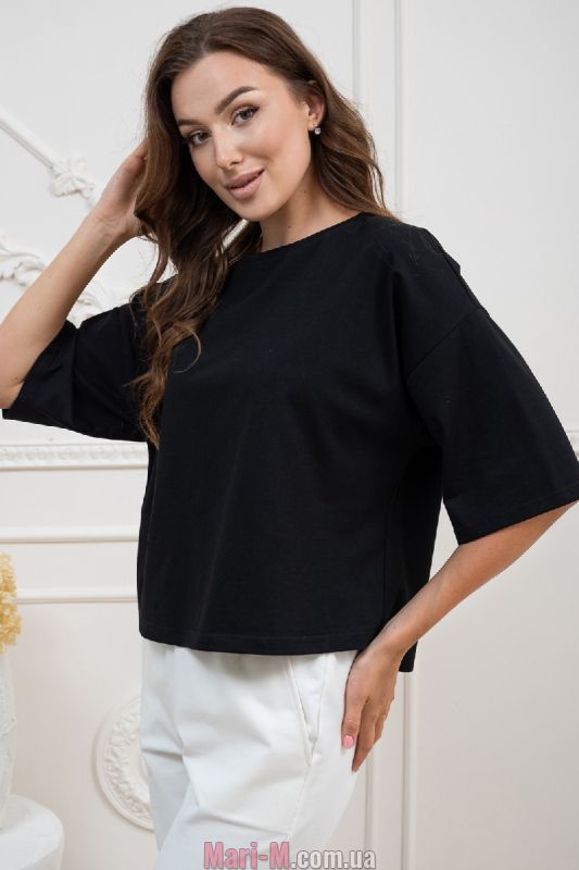 Хлопковая футболка 1522 Wiktoria. Свободная футболка оверсайз, с рукавами до локтя и неглубоким круглым вырезом горловины. Изготовлена из мягкого хлопкового трикотажа. Состав: 95% хлопок, 5% эластан. Брюки в комплект не входят. Их можно приобрести по ссылке ниже на странице, в товарах Для комплектации.