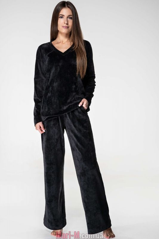 Велюровый комплект 1112 Wiktoria. Стильный комплект из приятного велюрового материала. Состоит из свободной кофты с V-образным вырезом и длинными рукавами-реглан и свободных брюк на мягкой резинке в поясе. Длинные рукава с пришивными манжетами. Брюки с удобными боковыми карманами. Костюм подходит как для сна, так и для отдыха дома. Состав: 100% полиэстер.